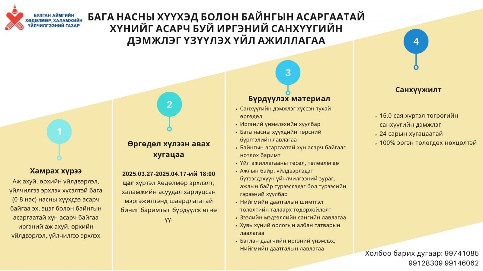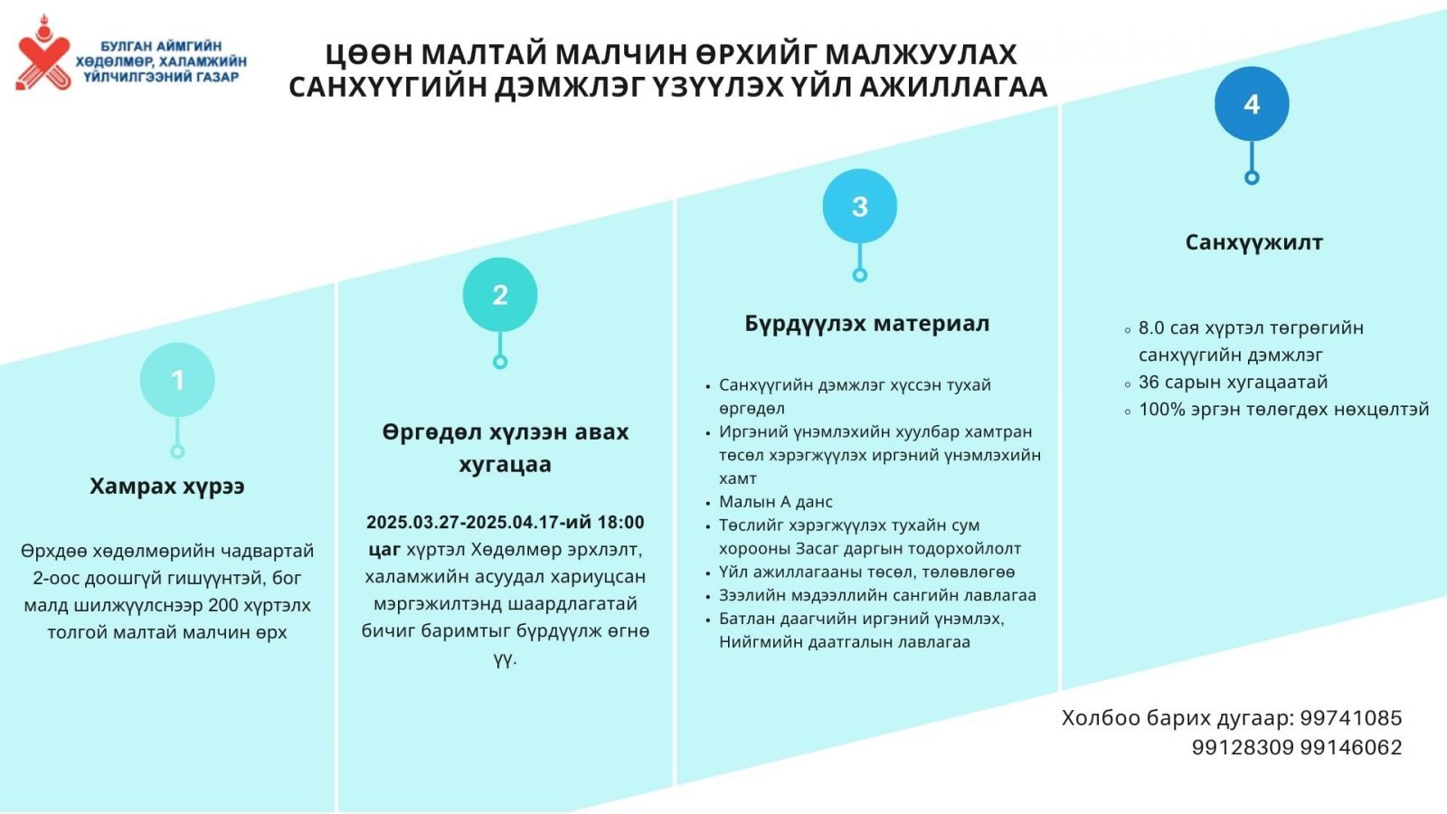 Төсөлд хамрагдах хүсэлтэй иргэд 99859435 дугаар холбогдоно уу.